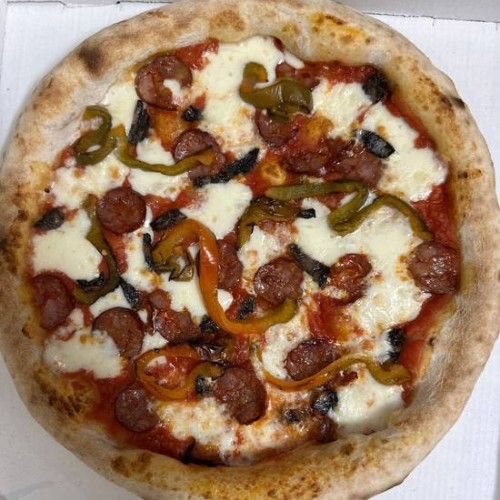 Molho de tomate pelado italiano, mozzarella fior de latte, chouriço porco preto, morcela, pimento grelhado